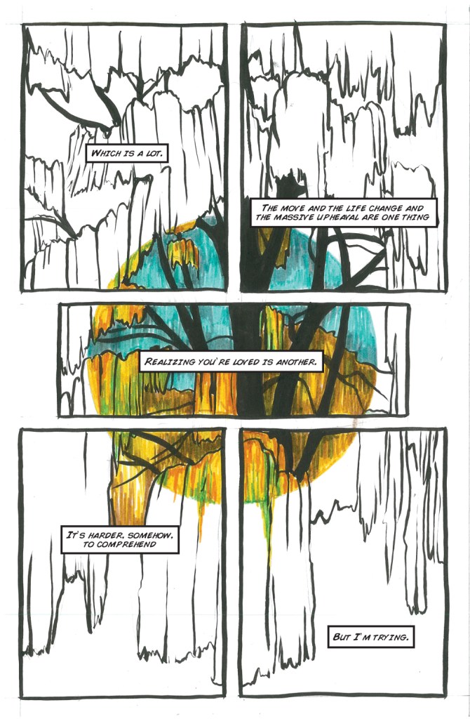 These 15 short comics are the curated result of trying to figure my own process of acclimatization to a New/Old life. They’re painful, hopeful, introspective, and steeped in a hefty does of WHYYYYY? They’re the most experimental of my experimental comics style; form follows feeling.